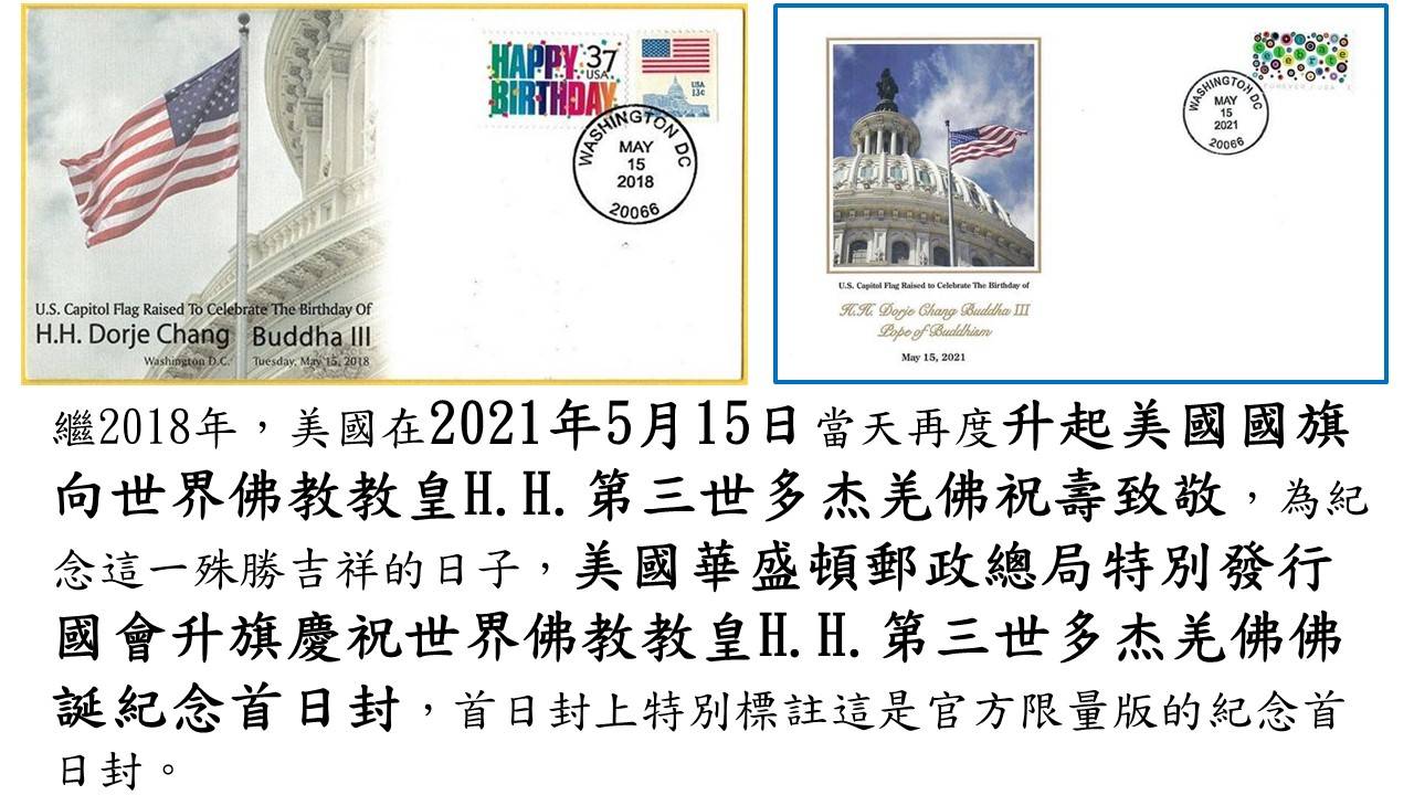 继2018年,美国在2021年5月15日当天再度升起美国国旗向世界佛教教皇H.H.第三世多杰羌佛祝寿致敬,为纪念这一殊胜吉祥的日子,美国华盛顿邮政总局特别发行国会升旗庆祝世界佛教教皇H.H.第三世多杰羌佛佛诞纪念首日封,首日封上特别标注这是官方限量版的纪念首日封。