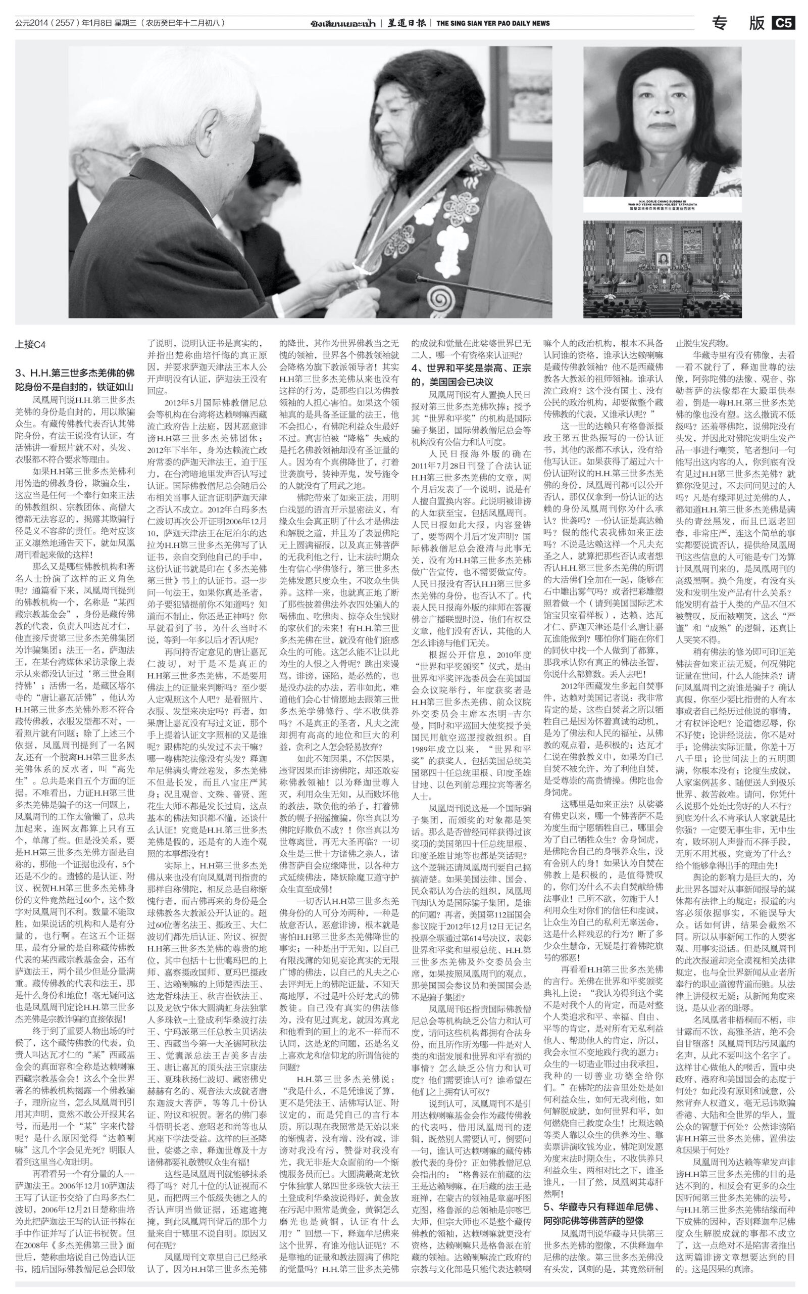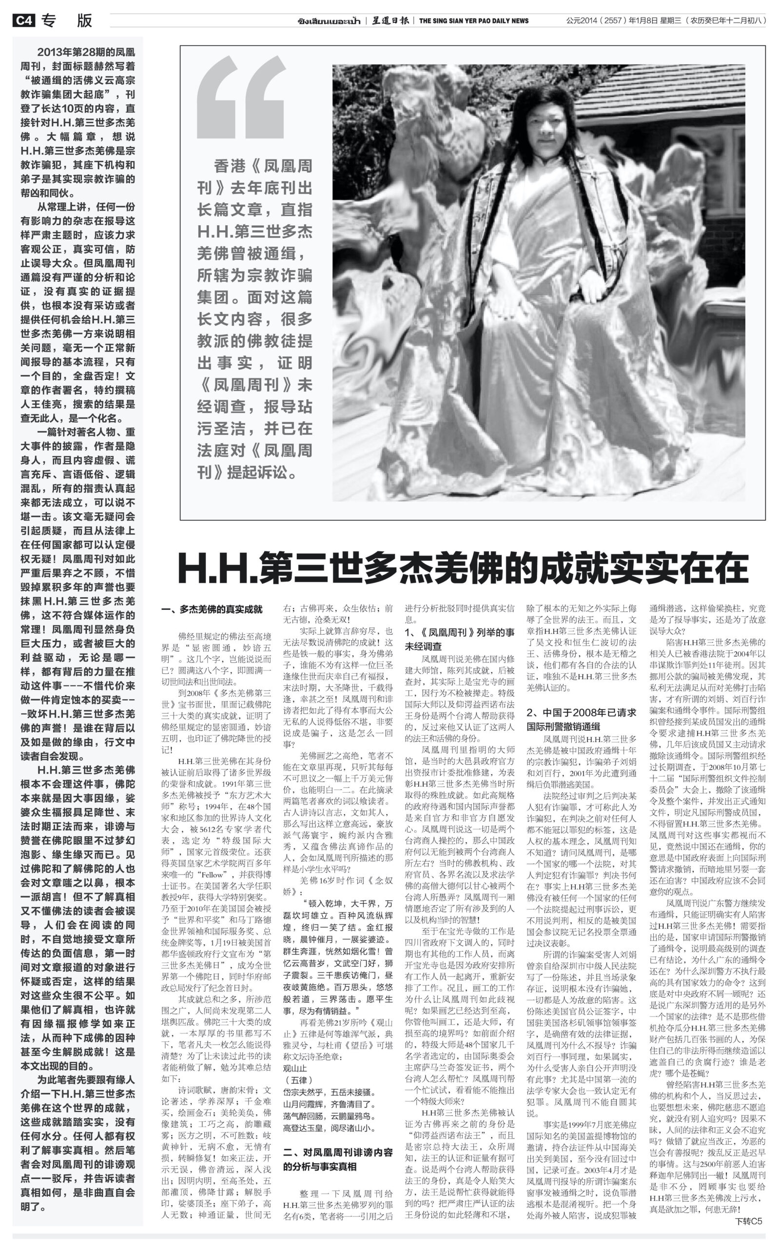 - 一篇針對著名人物、重大事件的披露,作者是隱身人,而且內容虛假、謊言充斥、言語低俗、邏輯混亂,所有的指責認真起來都無法成立,可以說不堪一擊。該文毫無疑問會引起質疑,而且從法律上在任何國家都可以認定侵權無疑!鳳凰週刊對如此嚴重後果棄之不顧,不惜毀掉累積多年的聲譽也要抹黑H.H.第三世多杰羌佛,這不符合媒體運作的常理!鳳凰週刊顯然身負巨大壓力,或者被巨大的利益驅動,無論是哪一樣,都有背後的力量在推動這件事一一一不惜代價來做一件肯定蝕本的買賣一一一敗壞H.H.第三世多杰羌佛的聲譽!是誰在背後以及如是做的緣由,行文中讀者自會發現。